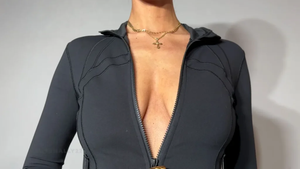 The video features Queen Ally, a white woman in her 20s with dark brown hair slicked back, tattoos on her fingers, and long nails. She’s fit and has a petite build. The scene starts with her posing in an indoor studio with softbox lighting. She touches her chest and poses for the camera, showing off her big tits. The shots are medium and close-up, static. There’s no specific sex act, just her masturbating and posing. Her tits are the main focus, looking natural and full.